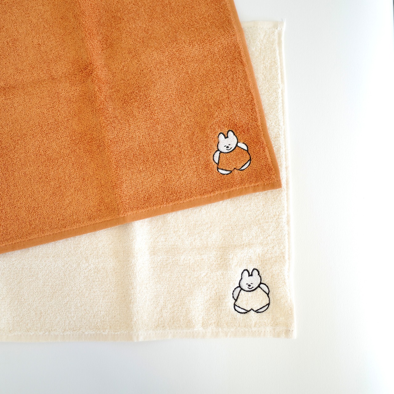 ハンカチと同じカラーの服を着ているみたいなうさちゃんが刺繍されています。
